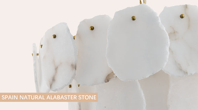 This image highlights the refined beauty of Spain-sourced natural alabaster, renowned for its soft translucence and cloud-like veining. Each stone panel displays unique patterns formed over thousands of years, allowing light to pass through with a warm, diffused glow. The material’s natural variations make every fixture one-of-a-kind, adding depth, elegance, and artisanal character to the design.