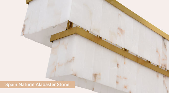This image highlights the refined beauty of Spain-sourced natural alabaster, renowned for its soft translucence and cloud-like veining. Each stone panel displays unique patterns formed over thousands of years, allowing light to pass through with a warm, diffused glow. The material’s natural variations make every fixture one-of-a-kind, adding depth, elegance, and artisanal character to the design.