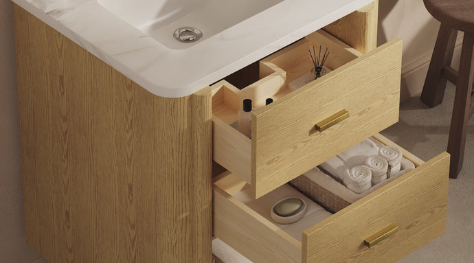 Its slim silhouette conceals an intelligently organized interior. Two smooth-gliding drawers securely stow away toiletries and essentials, while the integrated open shelf offers instant access to daily-use towels or decorative accents. In a compact footprint, it delivers maximized utility, transforming limited square footage into a model of effortless order and accessibility.