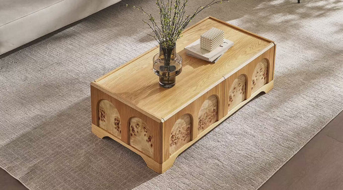 Crafted from high-quality multilayer panels overlaid with natural oak veneer and birch burl veneer, this coffee table celebrates the beauty of authentic wood. The open-pore natural finish preserves the unique grain patterns and textures of each panel, giving every piece a one-of-a-kind look and a warm, tactile feel. This construction not only enhances durability but also ensures long-lasting stability and resistance to warping.