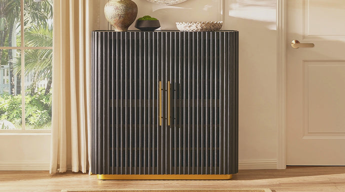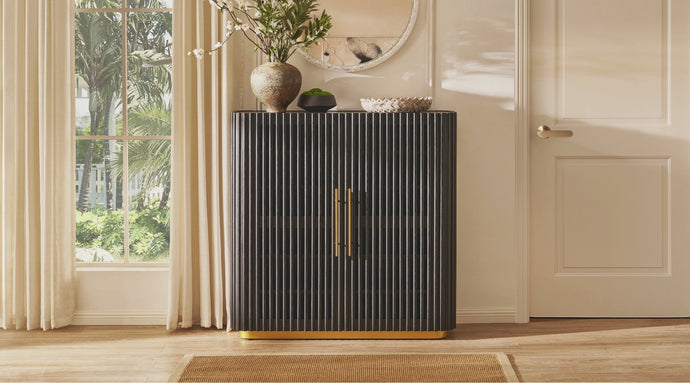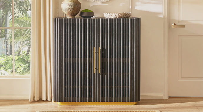 • Vertical slatted grille doors with brass-finished handles and legs for a refined touch