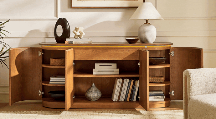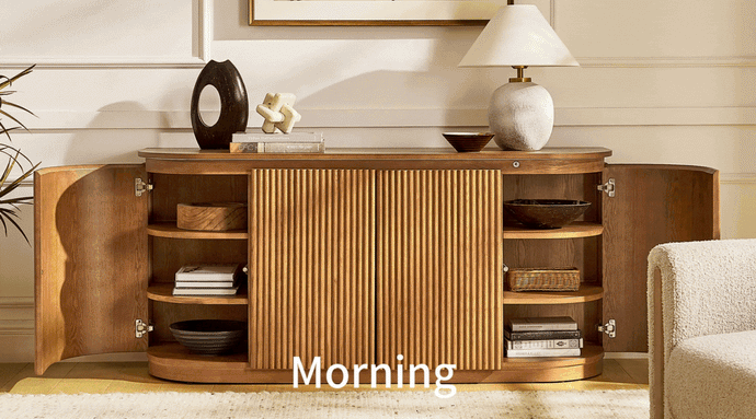 The sideboard’s handle-free design is very modern, and the curved doors on both sides look smooth and elegant. It offers plenty of storage space, easily accommodating all my tableware. The overall quality feels excellent, and I can already imagine it adding a stylish touch to my dining room.