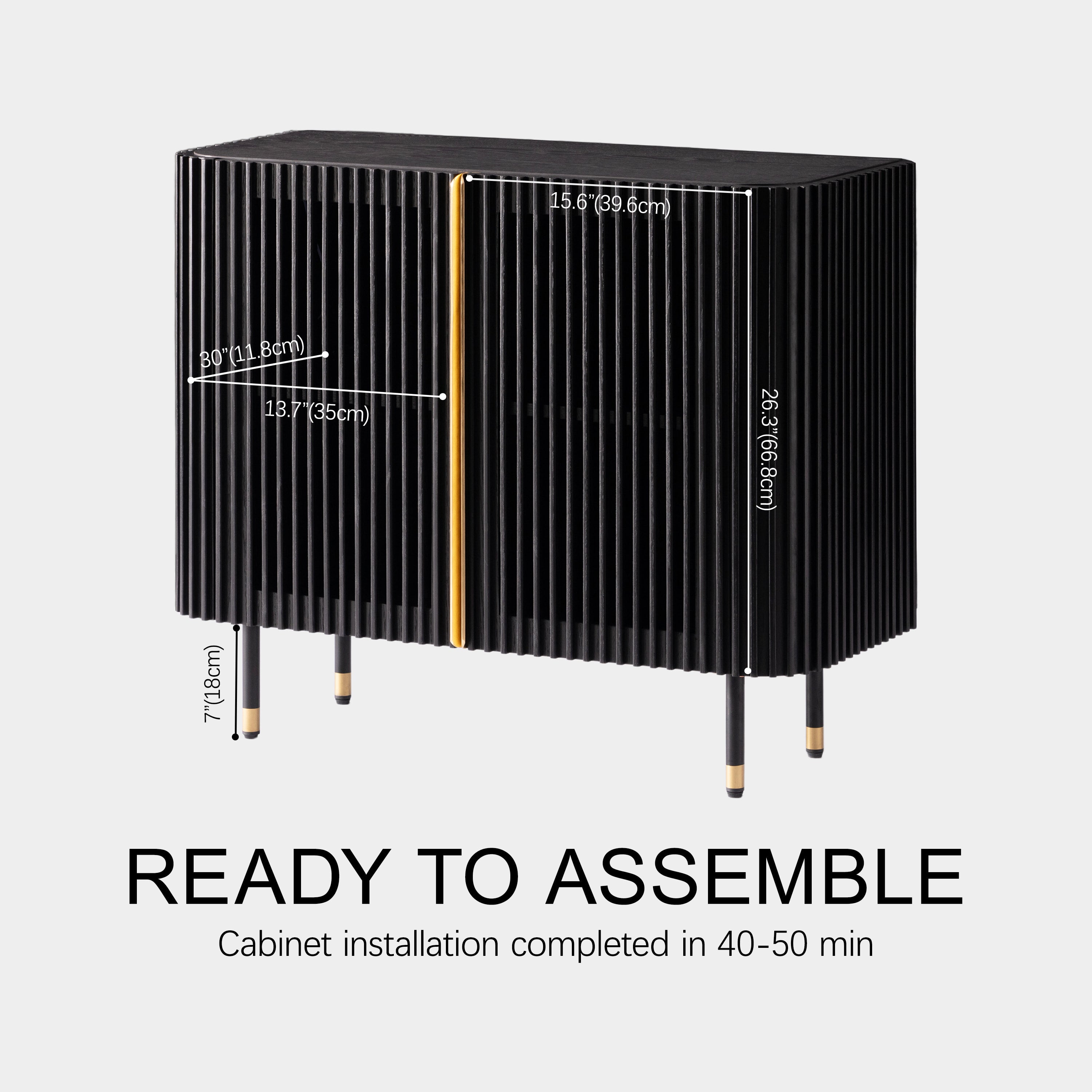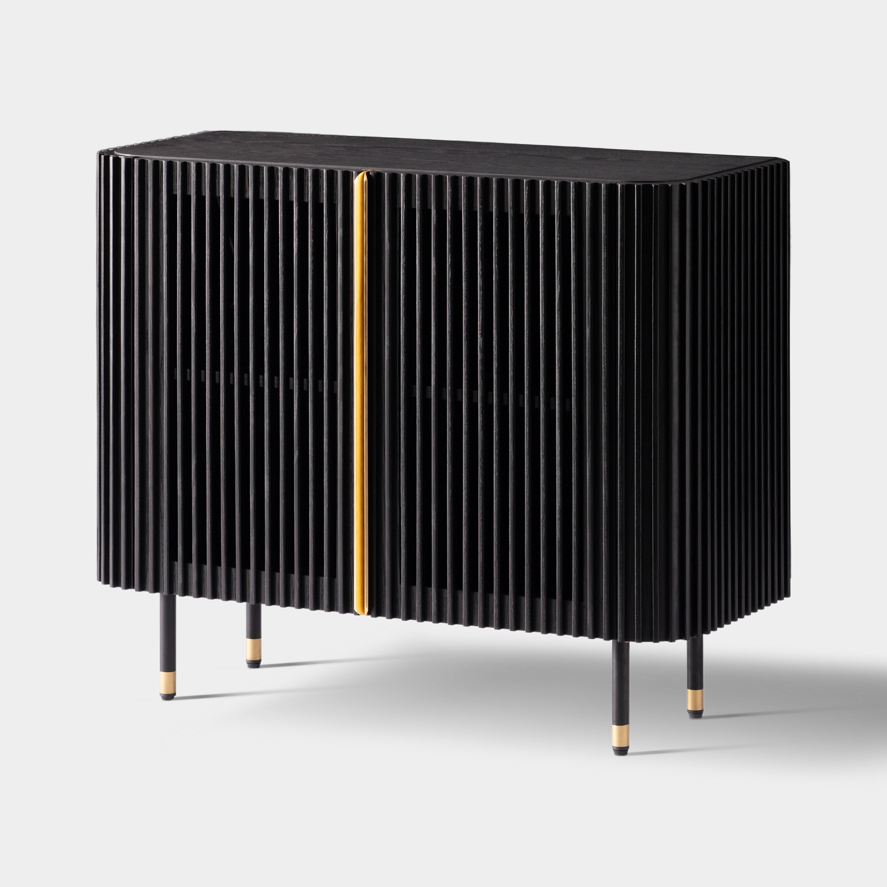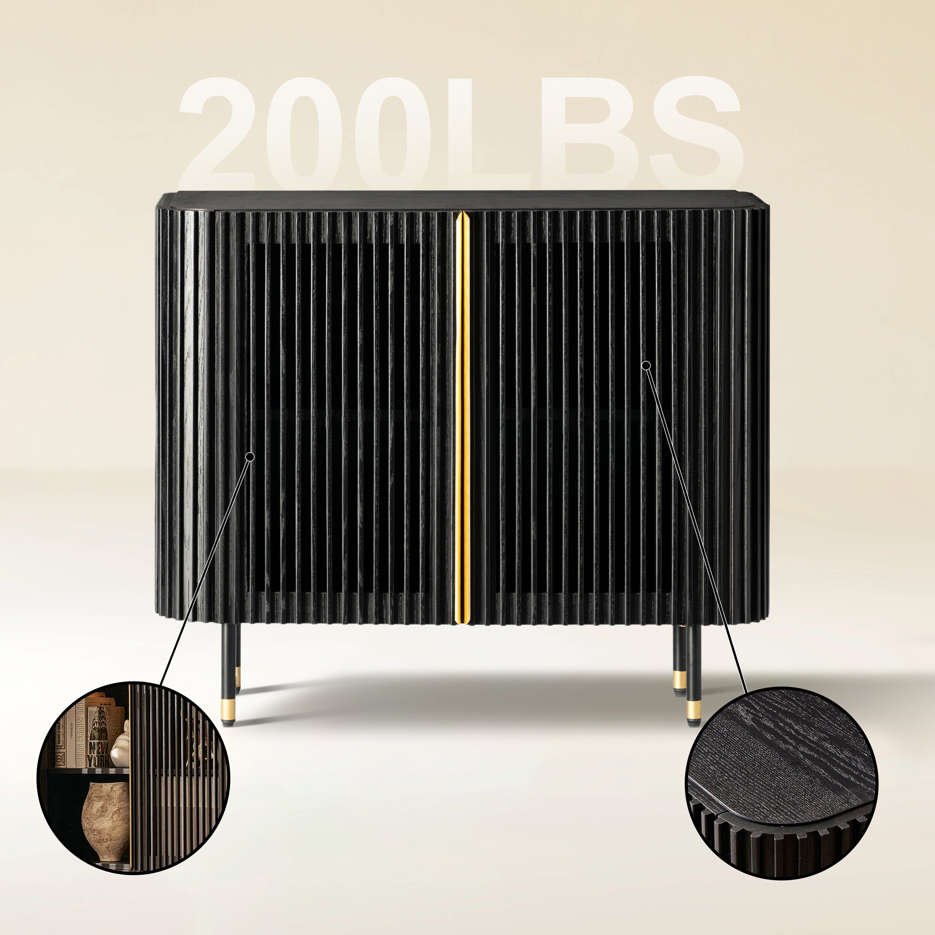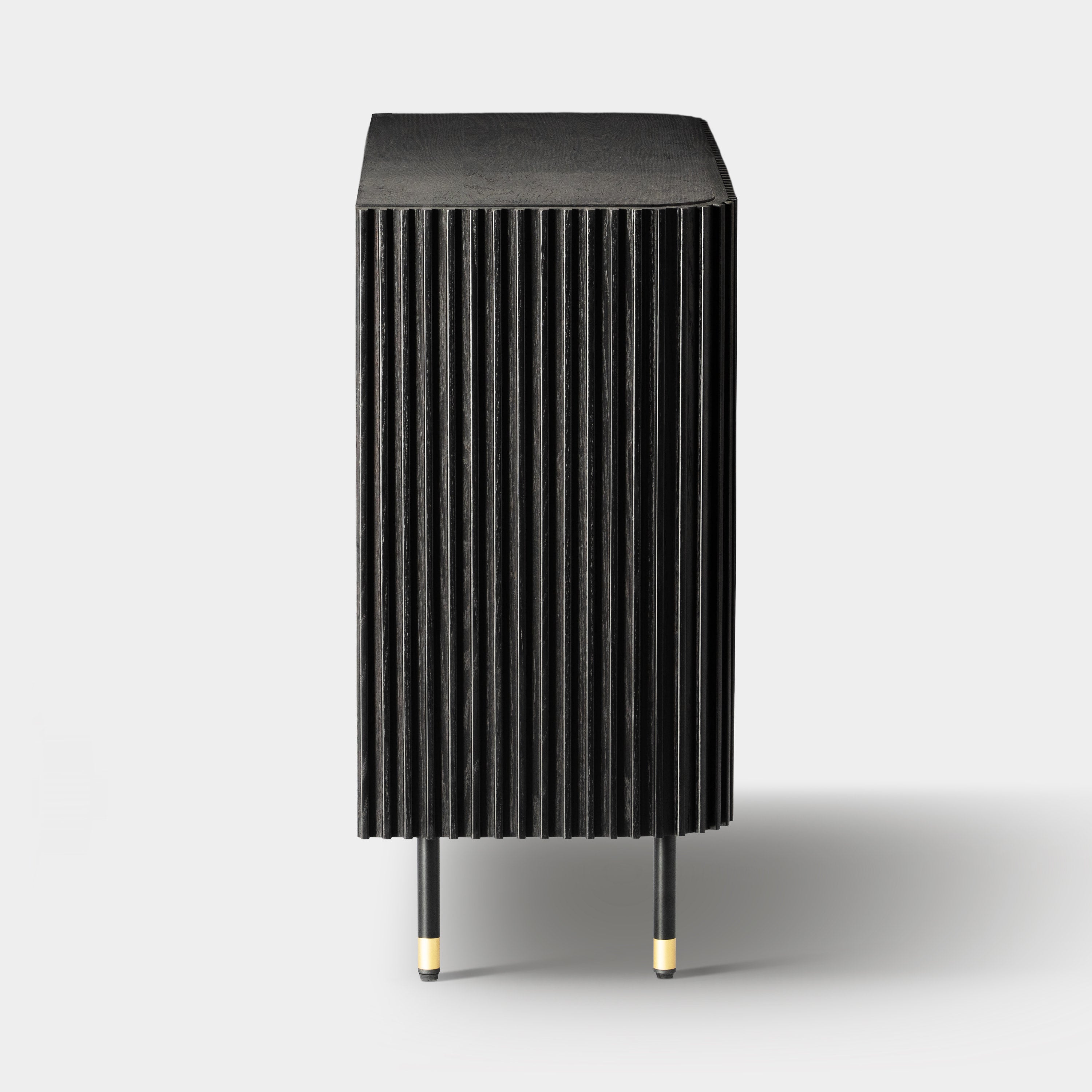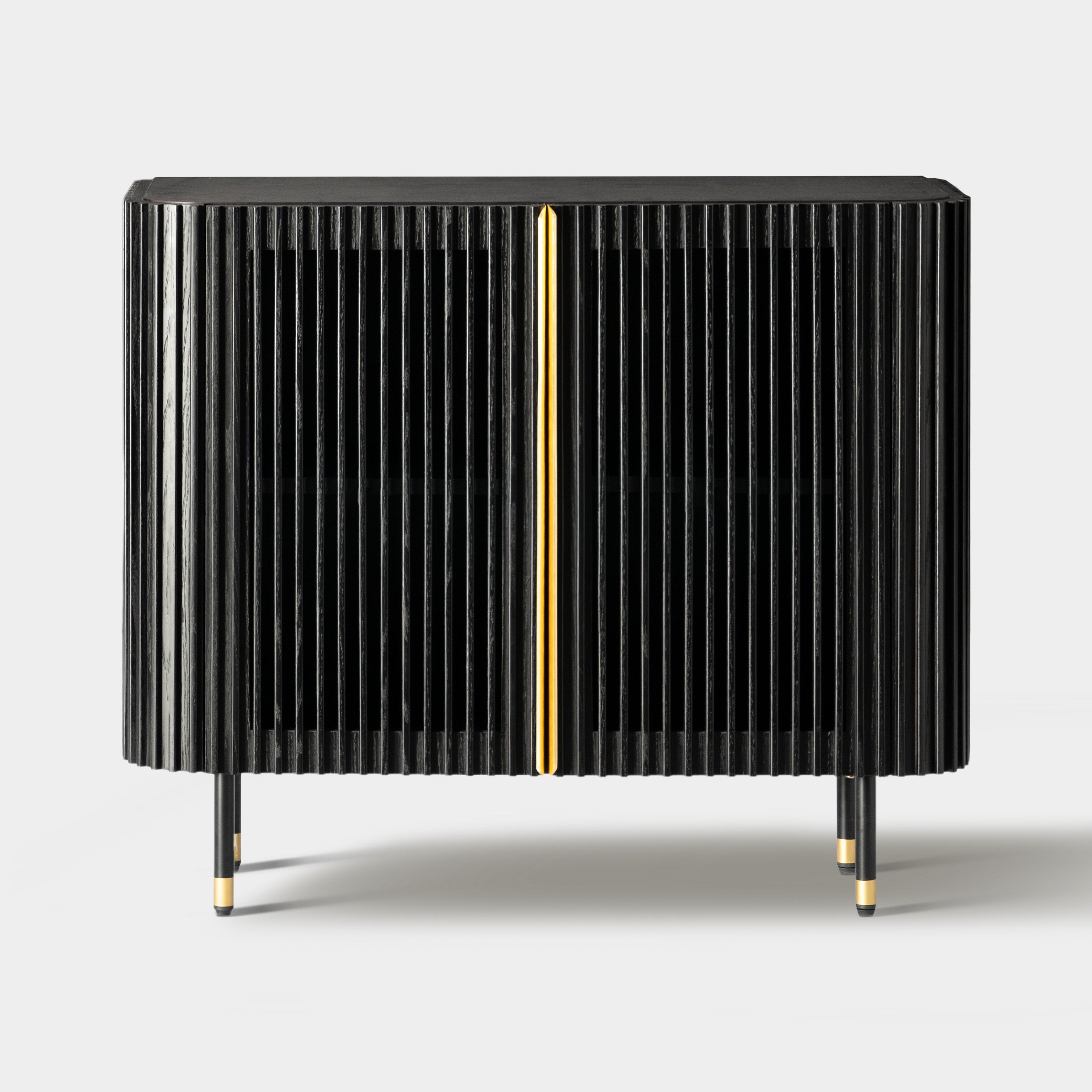 Ewan Series features an elegant design with sleek vertical stripes and a black oak finish, exuding modern elegance. The vertical leg design adds a touch of medieval charm, while the spacious interior provides ample storage space. Its refined style makes it a striking focal point in any contemporary living space.