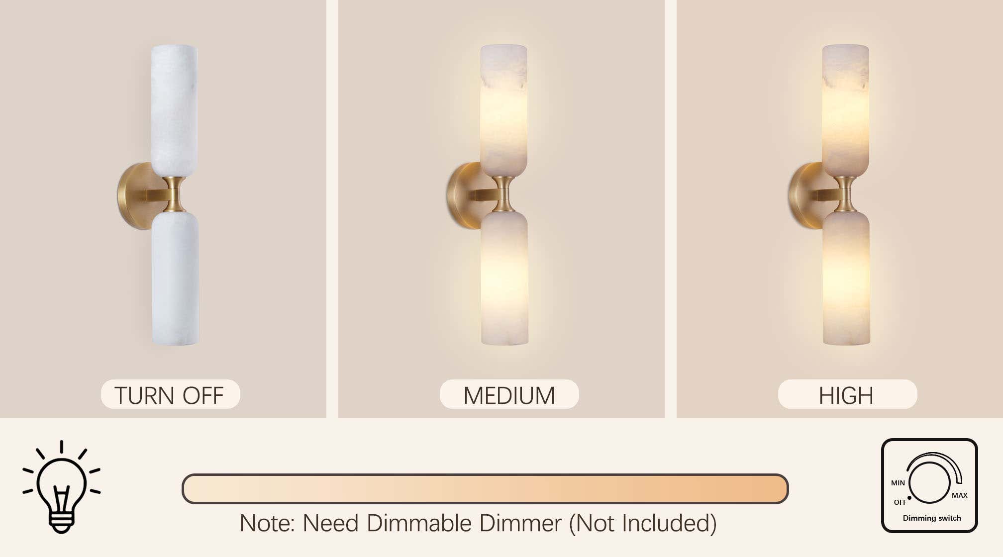Crafted from natural alabaster stone, this fixture delivers a warm, softly diffused glow with fully dimmable lighting. Please note that a compatible wall dimmer is required and should be prepared by the customer. The inherent translucence and organic veining of alabaster create an elegant atmosphere that adjusts effortlessly to your preferred brightness.