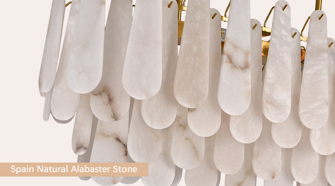 This image highlights the refined beauty of Spain-sourced natural alabaster, renowned for its soft translucence and cloud-like veining. Each stone panel displays unique patterns formed over thousands of years, allowing light to pass through with a warm, diffused glow. The material’s natural variations make every fixture one-of-a-kind, adding depth, elegance, and artisanal character to the design.