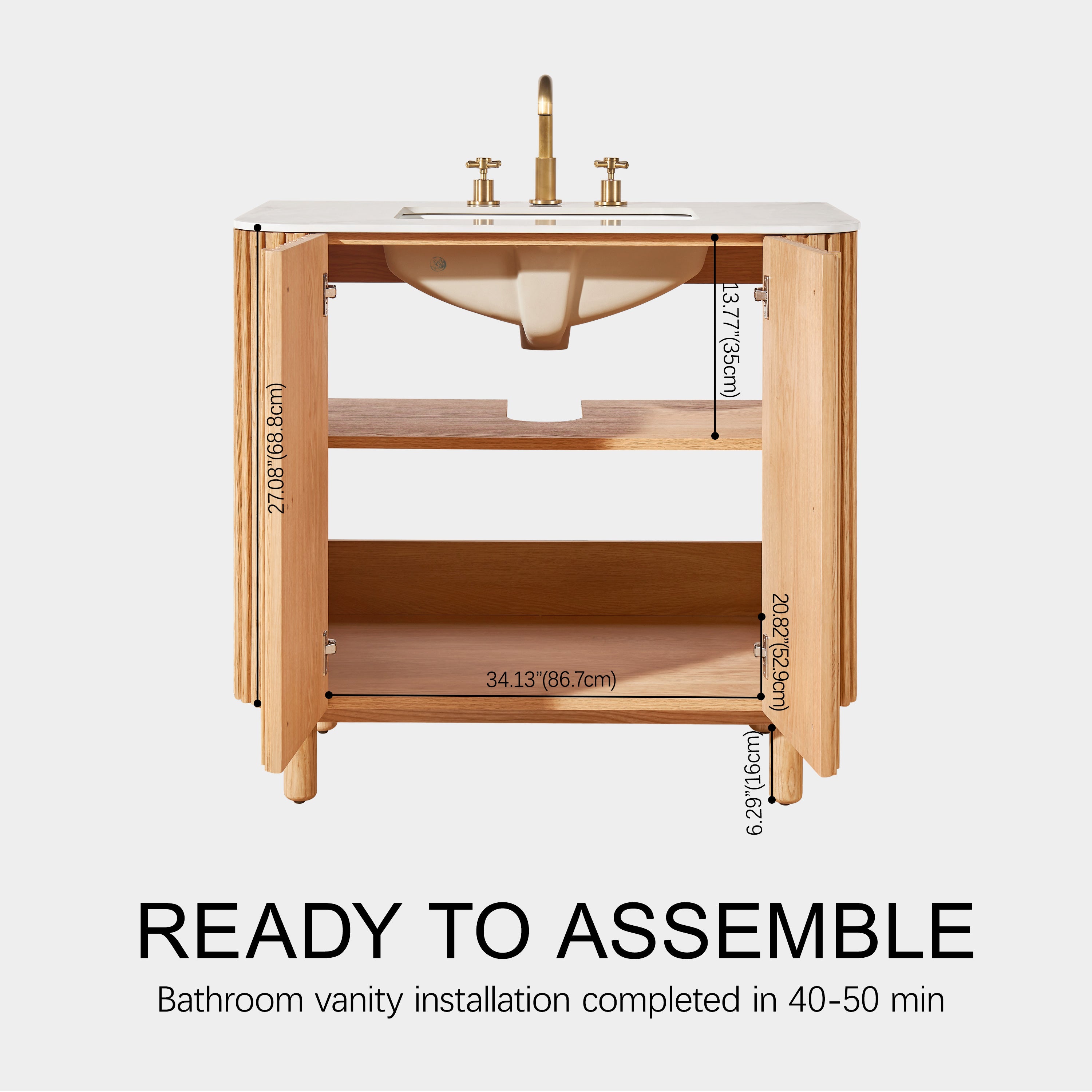 The Charlie Vanity embodies modern bathroom aesthetics with clean, sleek lines and refined craftsmanship. Its 12mm (0.47") Snowy White sintered stone countertop pairs beautifully with a red oak veneer finish, creating a pure yet warm visual impression. Solid ash wood legs and finely crafted slatted cabinet doors not only enhance the piece with natural texture but also highlight exquisite workmanship. With its low, steady structure and thoughtful storage design, it strikes a perfect balance between function and style, bringing a sense of tranquility and elegance to any bathroom space.