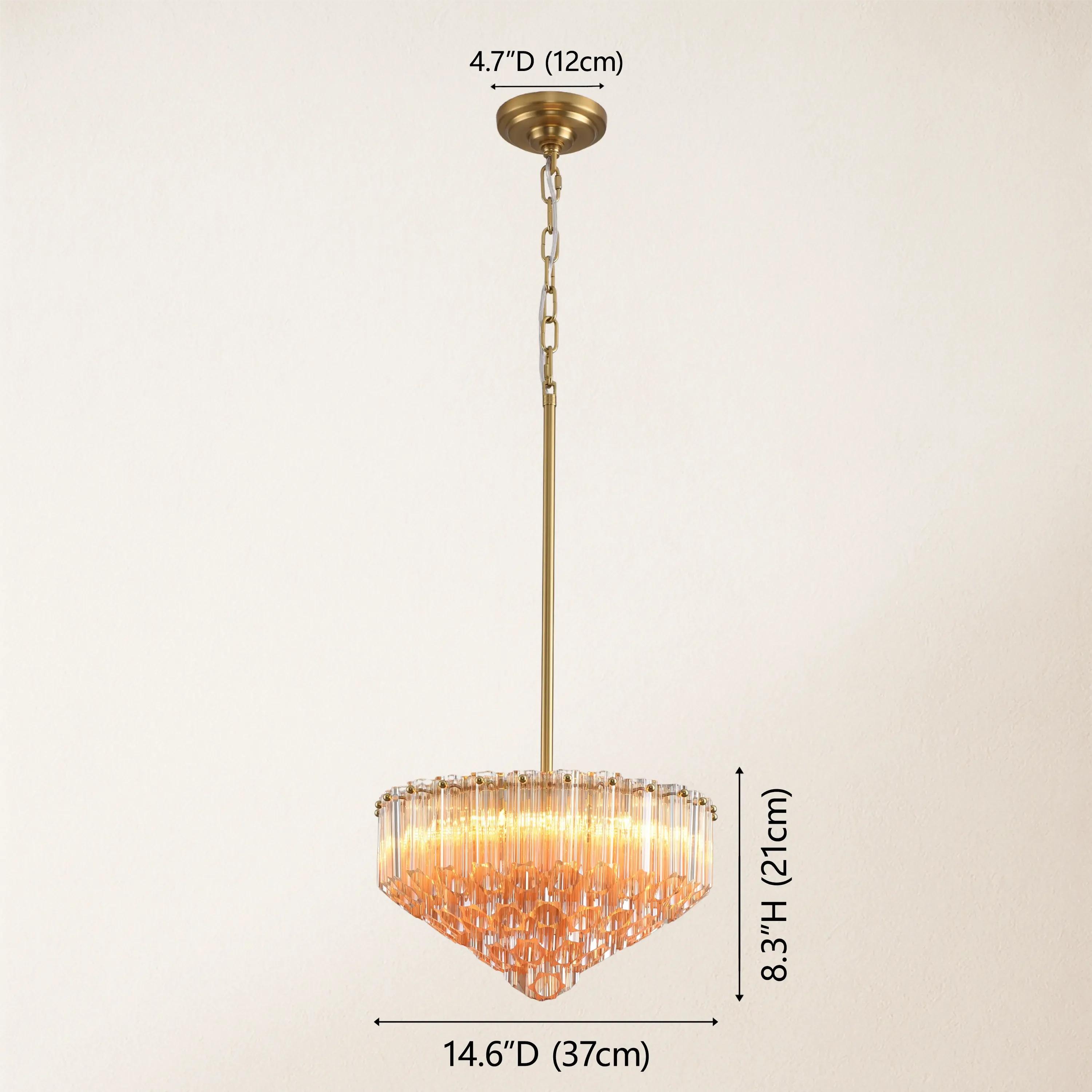 Meticulously crafted with over 100 amber‑tipped K9 crystal rods set within a brushed‑gold frame, the Ethereal Radiance chandelier casts a luxurious warm glow. Offered in two sizes—14″ diameter—this multi‑tier fixture brings refined elegance to dining rooms, kitchen islands, entryways, or boutique hospitality spaces. Compact yet radiant, it's compatible with sloped ceilings and designed to highlight every sparkling detail of its crystal accents.
