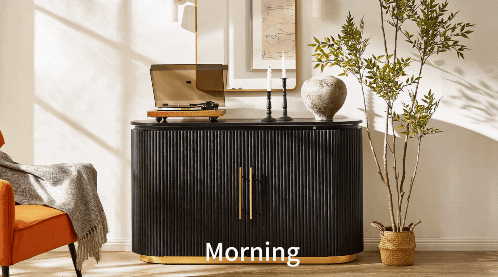 Blending modern minimalism with vintage allure, this sideboard features a fluid, rounded silhouette wrapped in rhythmic wood slats. The bold contrast between the rich black finish and the brushed brass metal base injects a touch of sophisticated luxury. With its seamless corner transitions and tactile detailing, this piece serves as a striking sculptural statement for contemporary interiors.