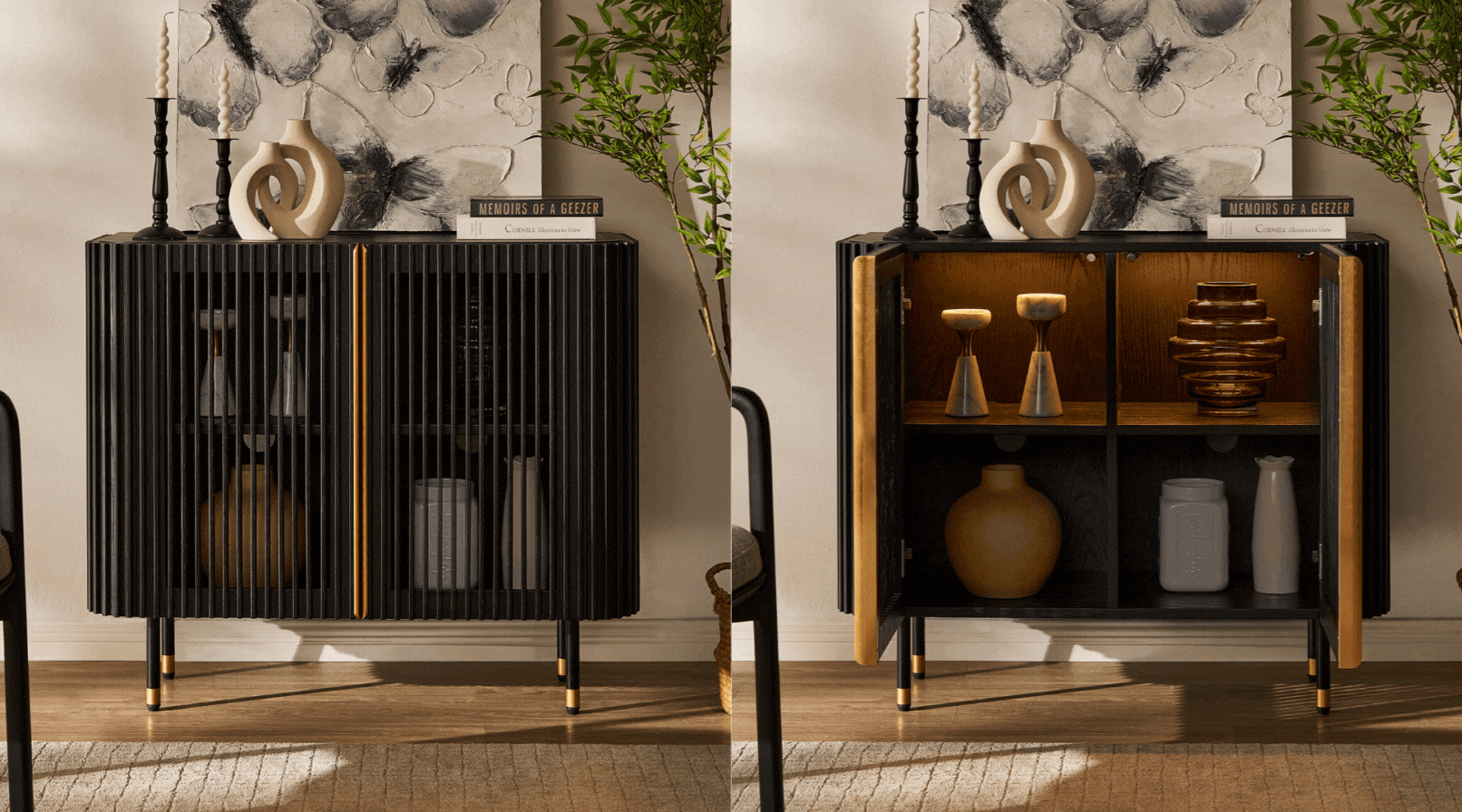 Ewan Series features an elegant design with sleek vertical stripes and a black oak finish, exuding modern elegance. The vertical leg design adds a touch of medieval charm, while the spacious interior provides ample storage space. Its refined style makes it a striking focal point in any contemporary living space.