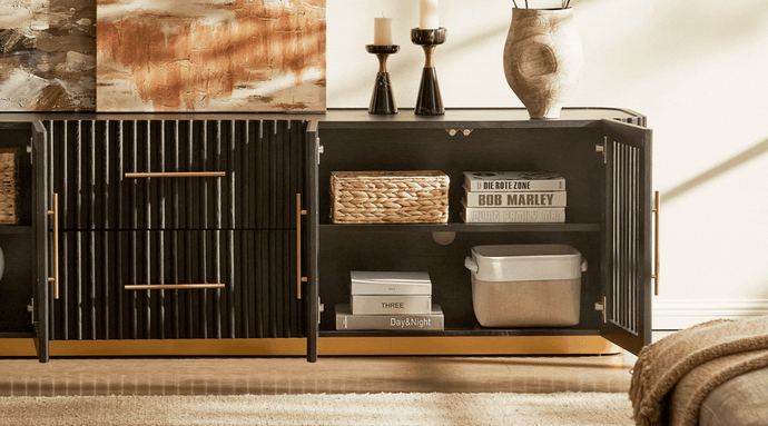 • Holton Oak Sideboard (56″ W) — curved silhouette with fluted doors; touch-control LED; four adjustable shelves with six back-panel covers for flexible storage and cable pass-through
