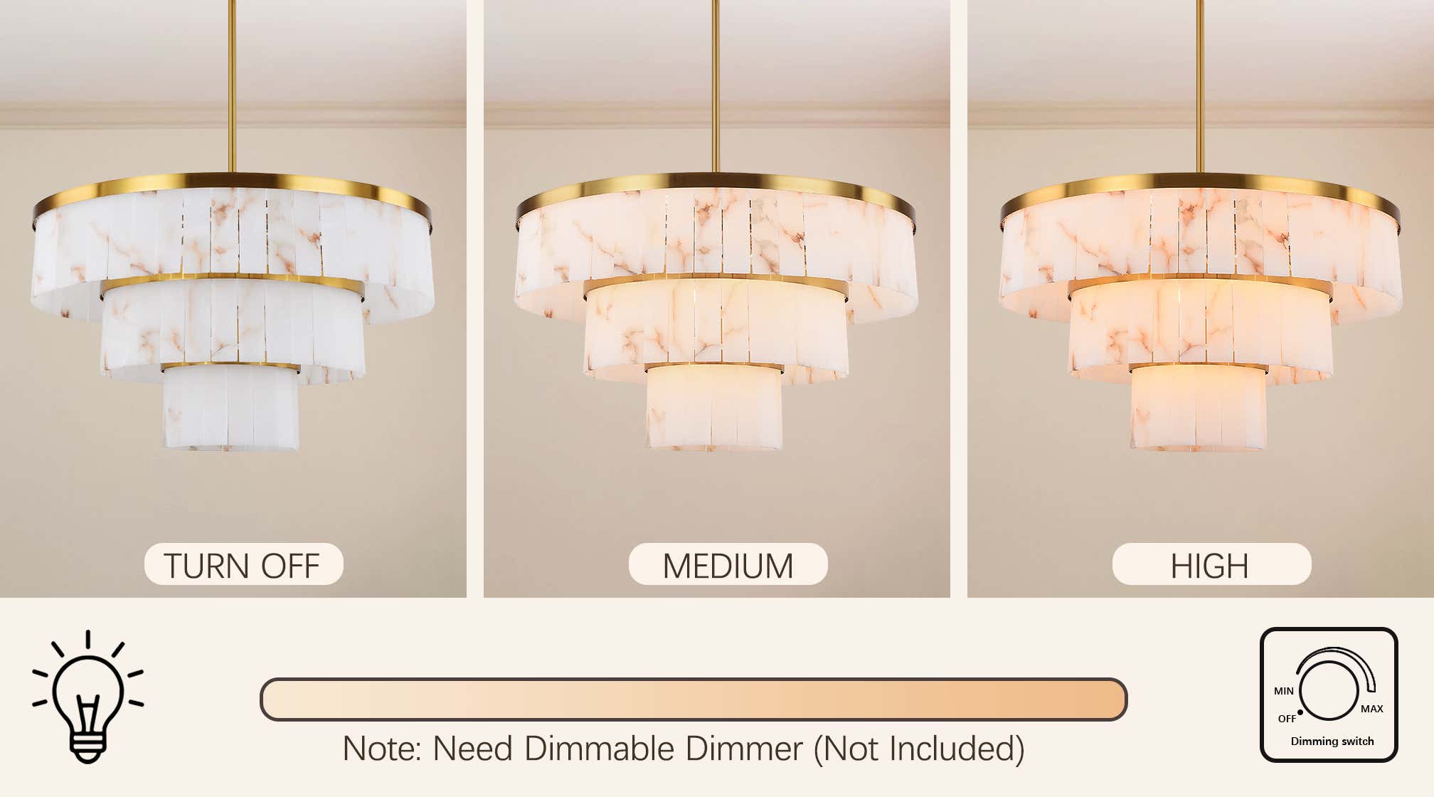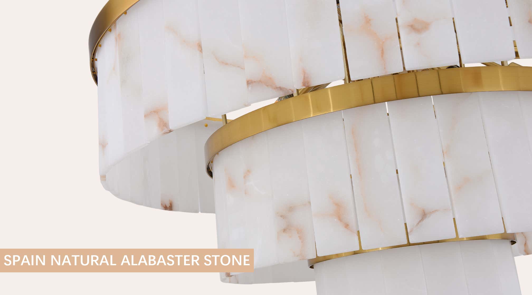 Crafted from natural alabaster, this 3-tier round chandelier features softly diffused layers that create a warm, ambient glow. The organic stone disks are hand-assembled onto a refined gold-finished frame, perfect for bringing modern elegance to dining rooms, foyers, staircases, or living spaces. Each piece is unique due to the beautiful veining of the alabaster.