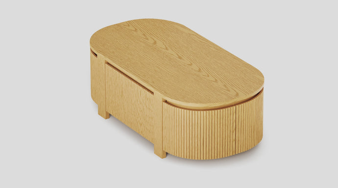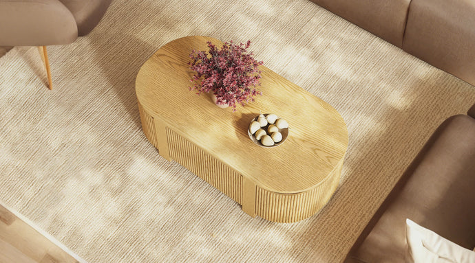 The Sutton coffee table seamlessly blends the warmth of natural wood with the needs of modern living. The cabinet body is crafted from multilayer board, meticulously overlaid with red oak veneer on visible surfaces, and finished in a natural matte lacquer. Through precision embossing, the natural grain of wood is authentically reproduced. The vertical stripe texture resembles tree rings, creating a rhythmic visual effect that brings a sense of vertical extension to the space and effortlessly softens any heaviness in the atmosphere.