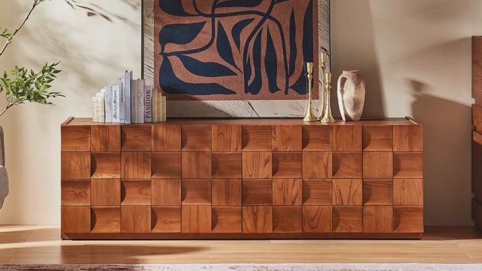 The Terra Collection brings sculptural beauty and organic warmth together in a striking, modern form. The Terra Cube Emboss Solid Wood TV Console 71” showcases bold carved wood textures and a clean geometric silhouette that instantly elevates any living space. Its meticulously embossed block-patterned sides add depth and craftsmanship, making it as much a functional centerpiece as it is a statement piece.